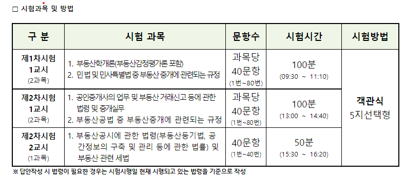 가장 중요한 시기로 이 일주일을 어떻게 활용하느냐에 따라 당락이 갈릴 수도 있습니다. 각 교시마다 2과목이 함께 묶여 있는 공인중개사 시험의 특성상 시험 당일의 시간 관리도 매우 중요합니다. 시험을 많이 치러 본 분들은 나름의 요령이 있겠지만 시험이 익숙하지 않은 분들에게는 이 일주일의 막판 정리 요령과 시간 관리의 중요성을 알려드리려 합니다.